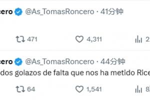 赖斯任意球双响时,龙赛罗发文:“赖斯在对阵我们时踢进两个令人难以置信的精彩任意球。太糟糕了。”